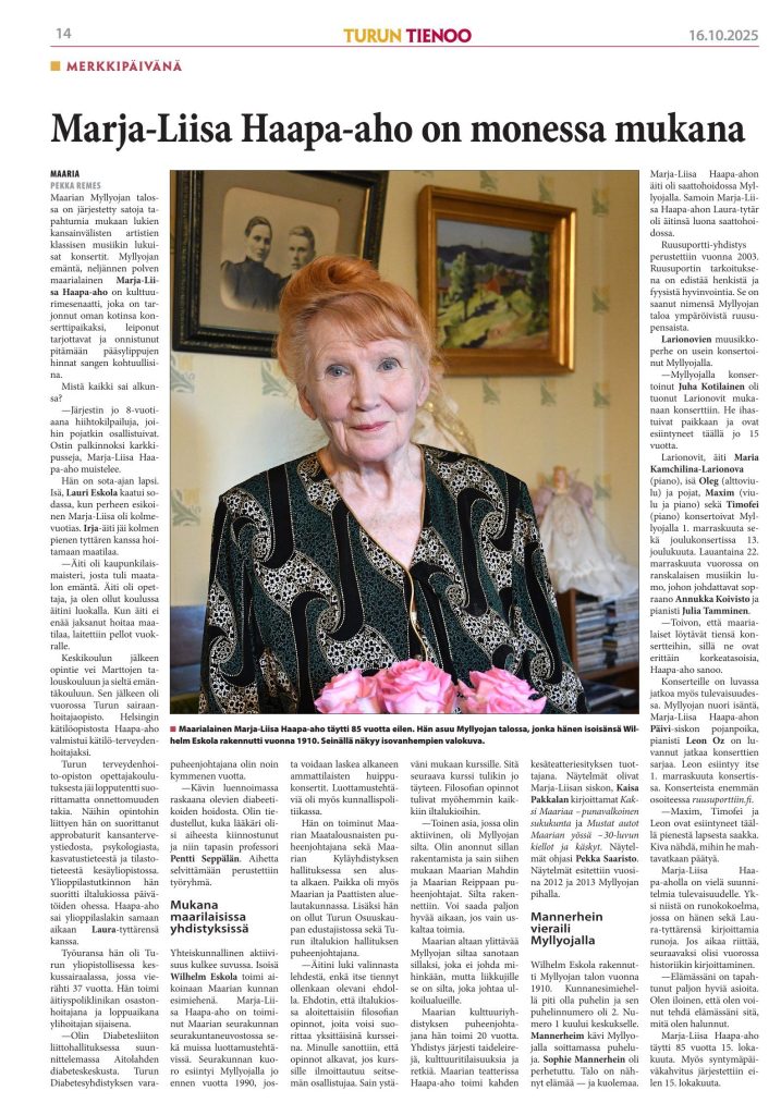 Turun Tienoo -paikallislehti julkaisi 16.10.2025 yläpuolella olevan “Marja-Liisa Haapa-aho on monessa mukana” -lehtiartikkelin. Haastattelun teki edellisenä päivänä, Marja-Liisan 85-vuotissyntymäpäivänä, lehden päätoimittaja Pekka Remes.