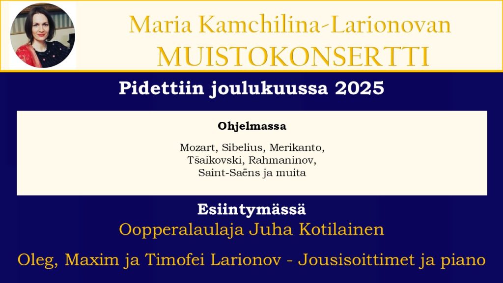 Äkillisen poismenon johdosta pianisti Maria Kamchilina-Larionovalle järjestettiin Myllyojan talossa Muistokonsertti joulukuussa 2025.